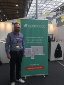 Natürlich sind die Zeiten, in denen auf der CEBIT bahnbrechende neue Technologien vorgestellt wurden, längst vorbei und einige Aussteller haben Schwierigkeiten, sich an die neue Richtung zu gewöhnen. Das zeigt sich bei einem Rundgang beim Münchner Unternehmer Dr. Kai Bielenberg, CFO von Openasapp aus München. Sie zeigen diese Woche ein wirklich innovatives Produkt: ein Programm, das es Unternehmen leicht macht, ihre eigenen Apps ohne eigene IT-Abteilung auf den Markt zu bringen.