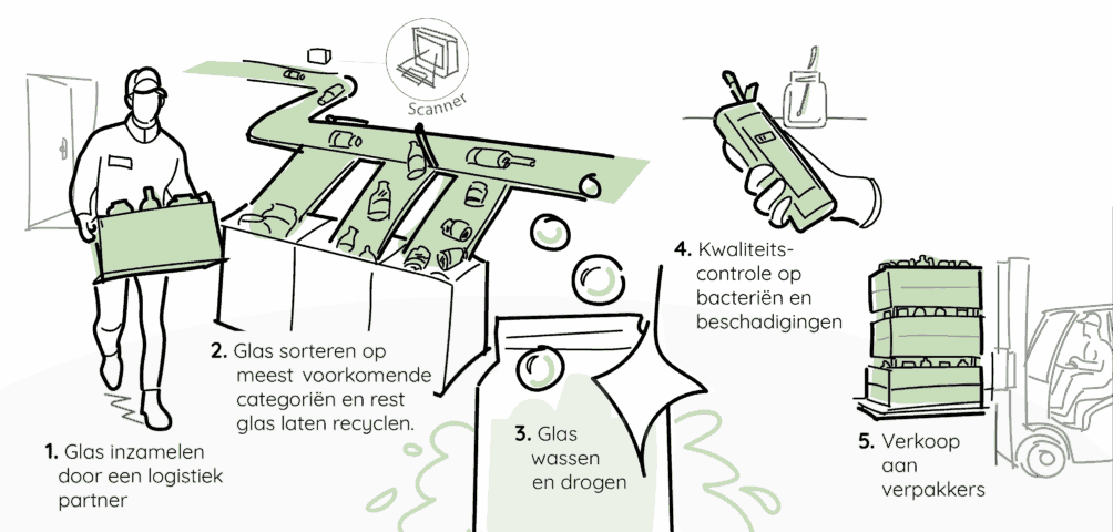 Viele Teile des Prozesses, wie die Rückführungslogistik, die Glasreinigung und die Qualitätskontrolle, sind bereits vorhanden. Der Schwerpunkt von PAKT liegt auf dem Modul, das die gemischten Glaspaletten sortiert. Wie kommt man von unsortiertem zu sortiertem Glas, das dem Waschprozess zugeführt werden kann?