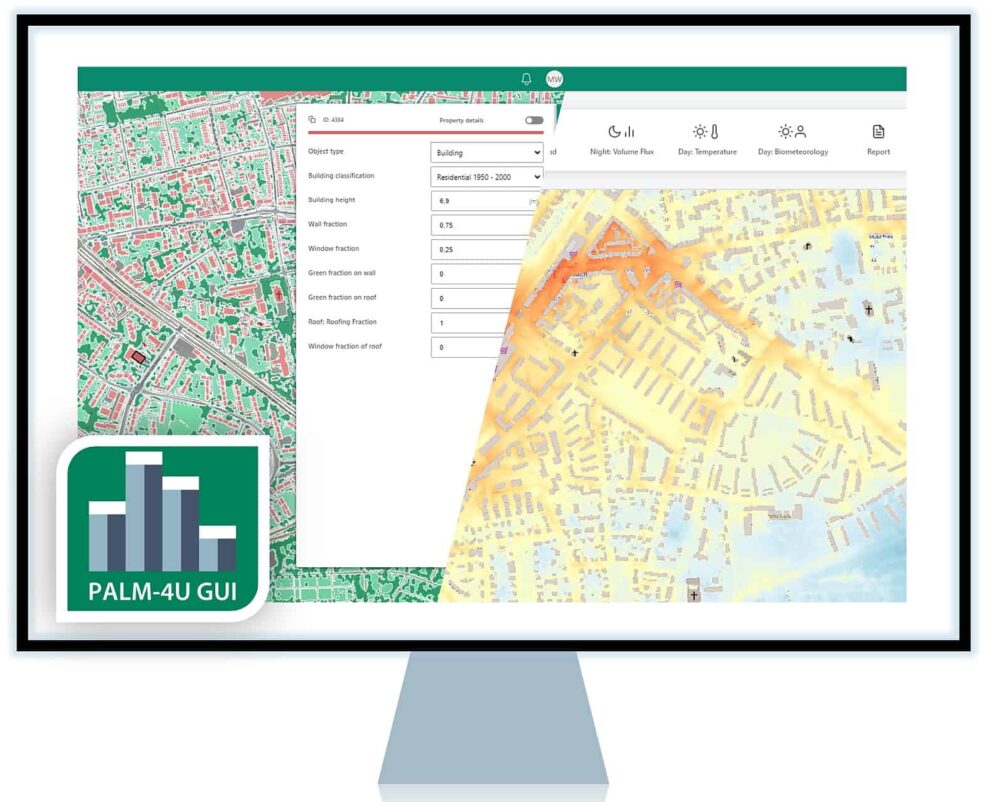Das Stadtklimamodell PALM-4U ermöglicht die Darstellung und Simulation baulicher Maßnahmen auf das urbane Klima und unterstützt damit Planungsbüros und Kommunen. So kann man beispielsweise simulieren, ob die Begrünung einer Fassade oder das Pflanzen von Bäumen den thermischen Komfort der Bewohnerinnen und Bewohner verbessert. Die Stadtklimasimulation ermöglicht es auch, Schwerpunkte der Hitzebelastung zu identifizieren und vor der Umsetzung baulicher Maßnahmen wie der Platzierung von Grünanlagen oder Entsiegelung von Flächen deren klimatische Folgen für das jeweilige Umfeld zu berechnen. Winkler und sein Team haben für das komplexe Tool eine Bedienoberfläche entwickelt, die PALM-4U GUI, die Übersichtlichkeit und logischen Aufbau bietet und gleichzeitig die Einstellung aller nötigen Funktionen und Parameter erlaubt.