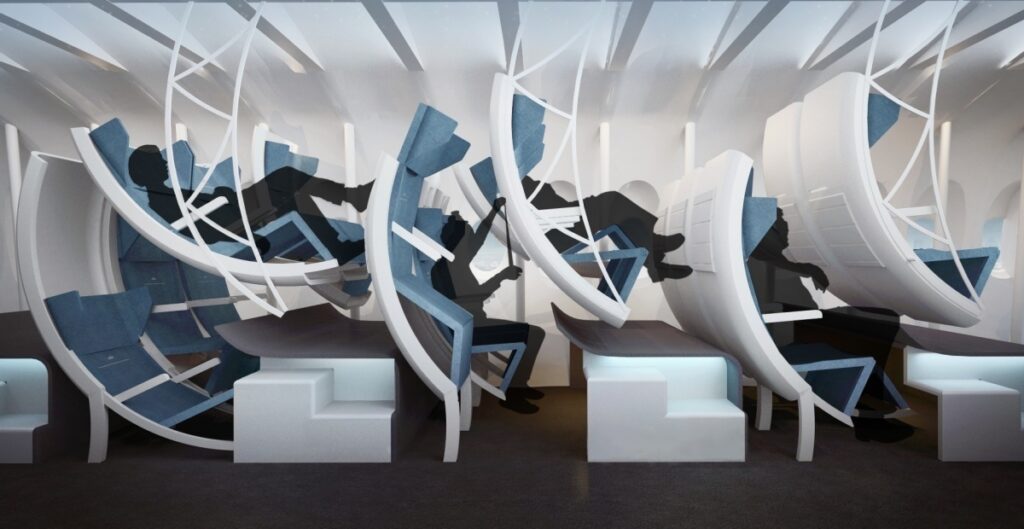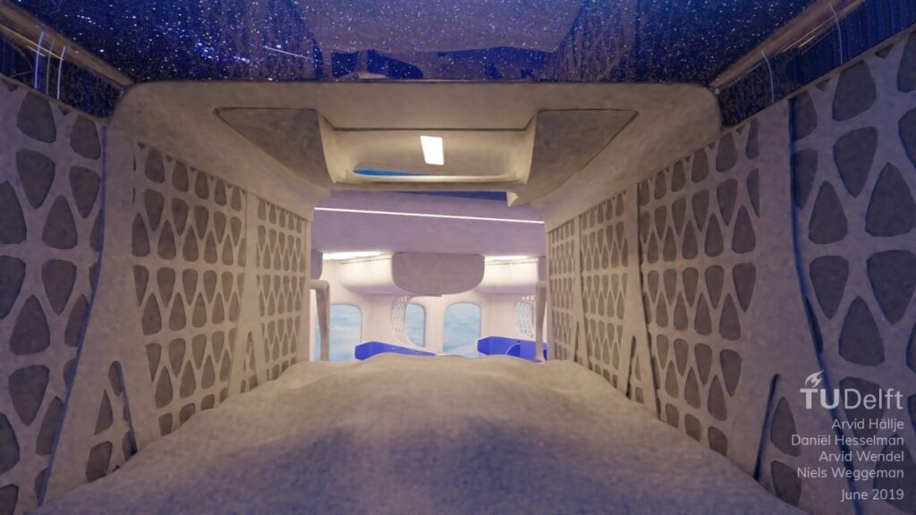 Das Ziel der Studenten ist es, die Erfahrung der Passagiere mit Leichtbaukonstruktionen zu verbessern, die Flüge nachhaltiger machen. Professor Peter Vink und der Industriedesigner Thomas Rotte betreuen die Studenten, die Entwürfe für die neue ovale Kabine gemacht haben. Sie entwarfen einen experimentellen, leichten Innenraum, der den Passieren Komfort bieten soll und dennoch mindestens für die gleiche Anzahl von Passagieren Platz bietet wie ein Airbus A350. Die Chaiselongue, das dreisitzige Sofa und die erweiterte Schlafmöglichkeit wurden für diesen Innenraum entworfen.