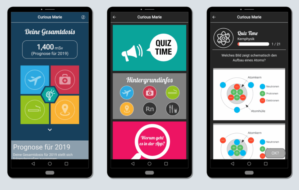 Und da die Themen Radioaktivität und Strahlung auf immer größere Aufmerksamkeit stoßen, gleichzeitig der Laie aber kaum weiß, welche Faktoren alle zusammenspielen, entwickelte ein Team junger Fachleute aus dem GRS AppLab die App namens „Curious Marie“. Mit dieser App lässt sich auf der Basis von individuellen Angaben eine Prognose der persönlichen Strahlenbelastung berechnen. Außerdem bietet „Curious Marie“ Hintergrundinformationen in Form eines Quiz, mit Animationsvideos und FAQ. So haben Interessierte die Möglichkeit, mehr über die Phänomene zu lernen.