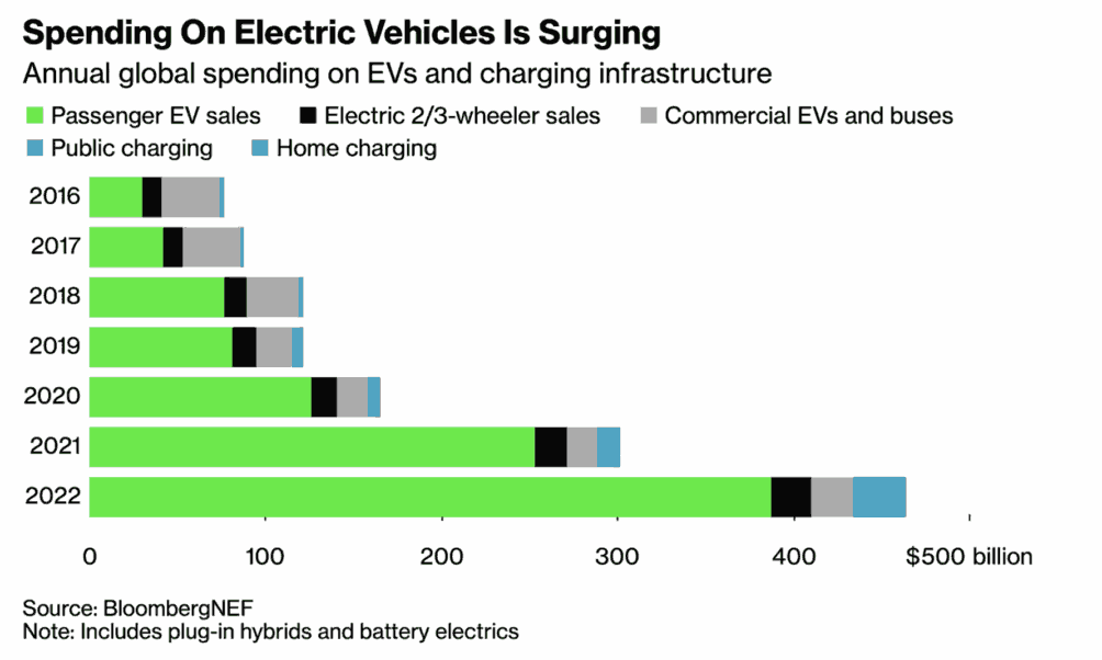 Die gute Nachricht: die weltweiten Ausgaben für Elektrofahrzeuge steigen laut Bloomberg rasant an. Die jährlichen Ausgaben für Elektrofahrzeuge werden sich im Jahr 2022 auf 388 Mrd. US-Dollar belaufen. Damit wird auch die Gesamtwert-Marke von 1 Billion US-Dollar der bisher verkauften Elektrofahrzeuge überschritten.
