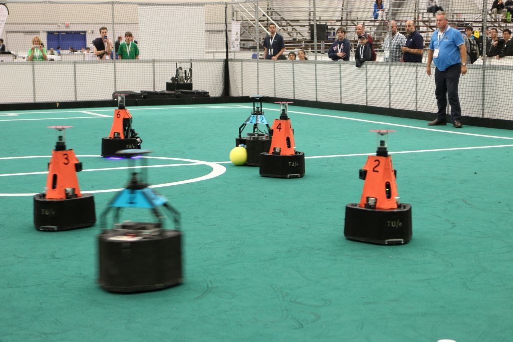 Die Roboter rasen mit viel Brummen über das Feld, sie passieren, dribbeln und schießen wie im „echten“ Fußball. Die Roboter halten sich gegenseitig mit kurzen ruckartigen Bewegungen vom Ball fern. Der RoboCup ist ein Wettbewerb, bei dem Roboter autonom gegeneinander spielen, nicht ferngesteuert werden und selbst entscheiden, wem sie den Ball zuspielen oder nicht. Jedes Jahr ändern sich die Regeln ein wenig, wenn Teams gewinnen wollen, müssen sie sich an die Regeln anpassen. Bis 2050 hofft die Organisation, den FIFA-Weltmeister besiegen zu können.