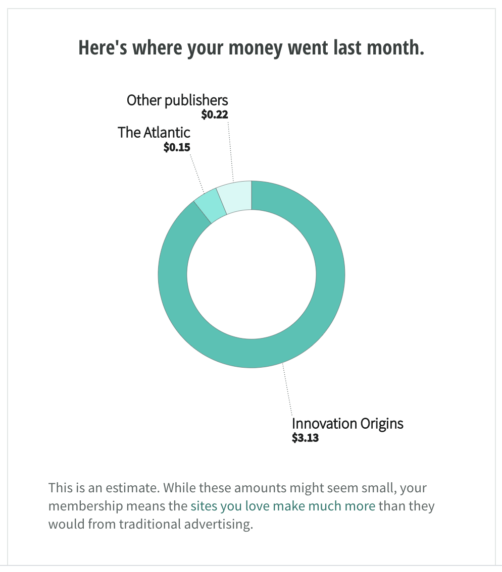 Scroll bekommt 1,50 Dollar pro 5,00 Dollar Abonnementgebühr: Das entspricht dem Modell von Apple, das ebenfalls ein Drittel der Verkäufe einstreicht. Der Rest des Betrags – 3,50 Dollar – geht an die Verlage. Der genaue Betrag pro Verlag basiert auf der Lesezeit: Wenn ein bestimmter Benutzer beispielsweise 10% seiner Lesezeit in einem Monat im Rahmen von Scroll bei Innovation Origins verbringt, gehen 35 Cent an Innovation Origins. Bei einer Lesezeit von 50% bekommt IO 1,75 Dollar. Nutzer können die tatsächliche Verteilung in persönlichen Übersichten sehen. Das sieht so aus: