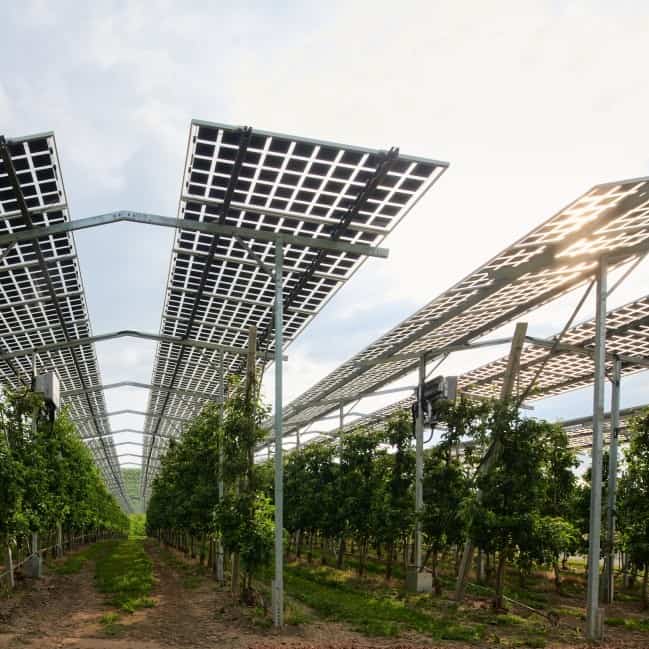 - Der Gesamtenergieertrag ist geringer. Im Vergleich zu einem normalen Solarpark passen weniger Module auf dieselbe Fläche. Da die Module Platz lassen müssen, um einen Teil des Lichts durchzulassen, wird nicht die gesamte Fläche abgedeckt.