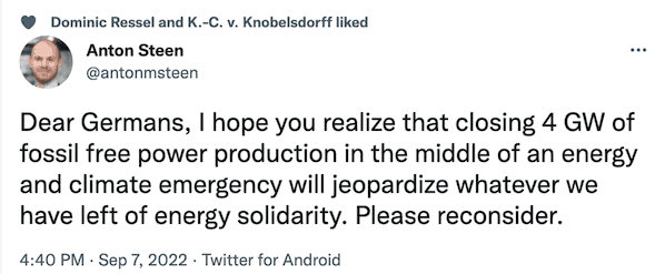Die Energieprofis um Deutschland herum schütteln mit dem Kopf und mahnen mehr Solidarität an. Norwegen und Schweden überlegen schon, ob sie im Winter mit Stromlieferungen aushelfen sollten, wo doch die Deutschen den europäischen Energieverbund offenbar mit Füßen treten, indem sie beispielsweise die letzten AKWs abschalten oder in den teuren Stand-By schicken wollen. Der ist an, man verzeihe mir die drastischen Worte, Hirnlosigkeit nicht mehr zu toppen. Man hält AKW in „Reserve“, zahlt die Unterhalts-Kosten, lässt sie aber keinen Strom im Streckbetrieb erzeugen, damit sie Geld verdienen und das Netz stabilisieren helfen. Deutsche „Energiesolidarität“ eben.