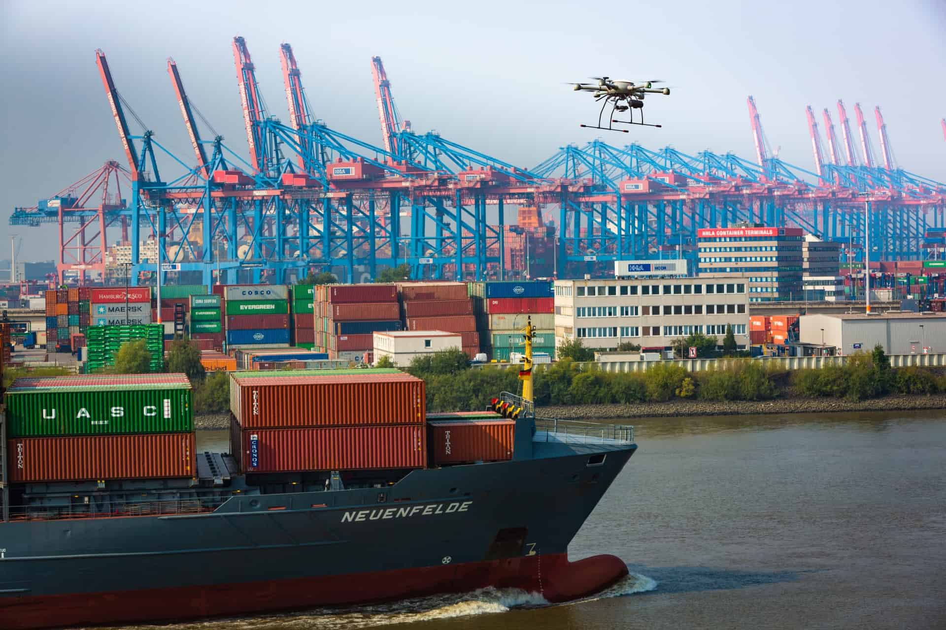 Foto oben: Eine Drohne bei einem Flug im Rahmen des U-Space-Reallabors Hamburger Hafen.