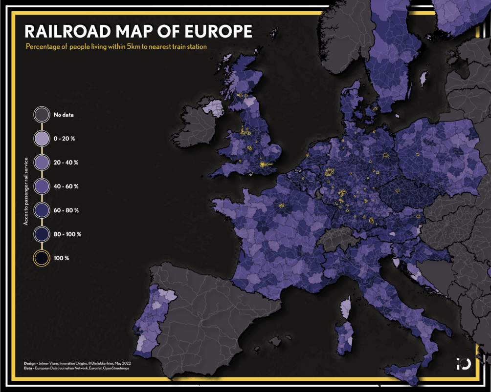 Auch die Anzahl der Einwohner, die weniger als 5 km von einem Bahnhof entfernt wohnen, ist an den violetten Farben zu erkennen. In den gelb schattierten Gebieten lebt die gesamte Bevölkerung in angemessener Entfernung zu einem Bahnhof.