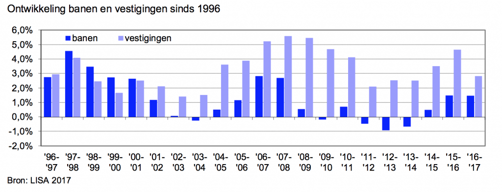 In 2017, as in 2016, employment in the Netherlands as a whole increased by 1.5%. The absolute growth rate was 122,280 jobs. The number of work sites also increased, with a growth rate of 2.8%, but less than in 2016 (4.7%). For the first time in 2017, the Netherlands has more than 8.4 million jobs, almost 2 million more than in 1996. In recent years, the growth in the number of branches has mainly been caused by a continuing high number of people who start for themselves. As a result, the development of the number of work sites since 2000 has been more positive than the number of jobs.