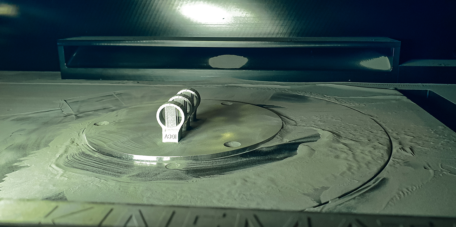The manufacturing process works as follows: A laser beam is passed over a bed of fine metal powder. At the point where the laser beam hits the powder, the powder melts and then solidifies into a composite material. This is repeated over and over again. The ring is built layer by layer, but a vanity is left open for the electronics. Then the process is stopped halfway through. A robotic system automatically grabs an RFID chip from the warehouse and places it inside the cavity before continuing on with the 3D printing process.