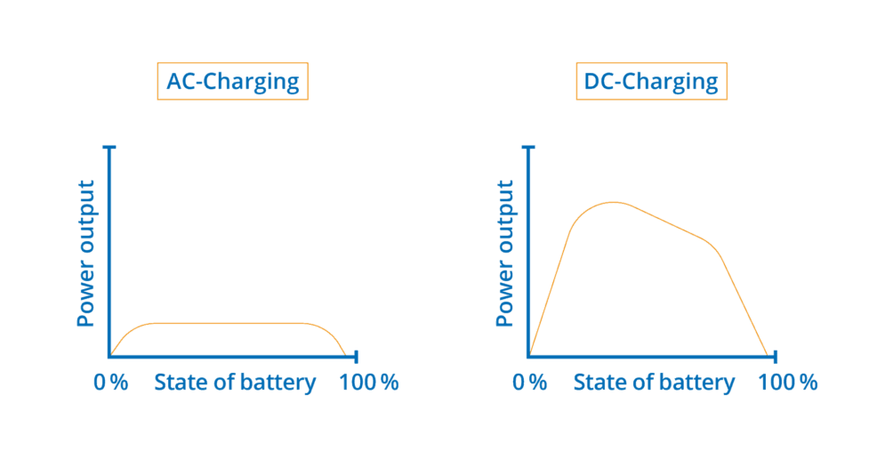 Charging with direct current can be up to ten times faster than alternating current. The charging curve is another important aspect to understand when comparing the two charging modes. This curve represents the speed variation an EV charges during a charging session.