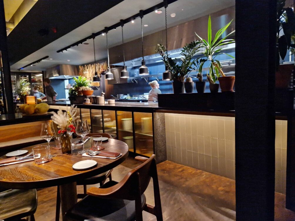 The modern-looking hall, with suffused lights, makes the visitor – there is room for a few tens of people – feel welcome with its coziness. At the entrance, dark wooden tables and furniture stand in stark contrast with soft ochre chairs. On the left-hand side is the bar, where one of the staff bartenders finishes the final touches before the arrival of the guests. Pan drizzles and kitchen noise compose, with the low background music, the evening’s soundtrack. Ample windows overlook Telliskivi and offer a view of the medieval city walls and St. Olaf’s church tower.
