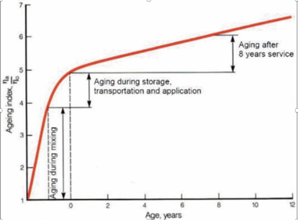 The conditions in the refinery and during paving play the biggest role in the aging of bitumen. The slope of the aging curve is highest in the refinery and during paving and flattens out only after paving.