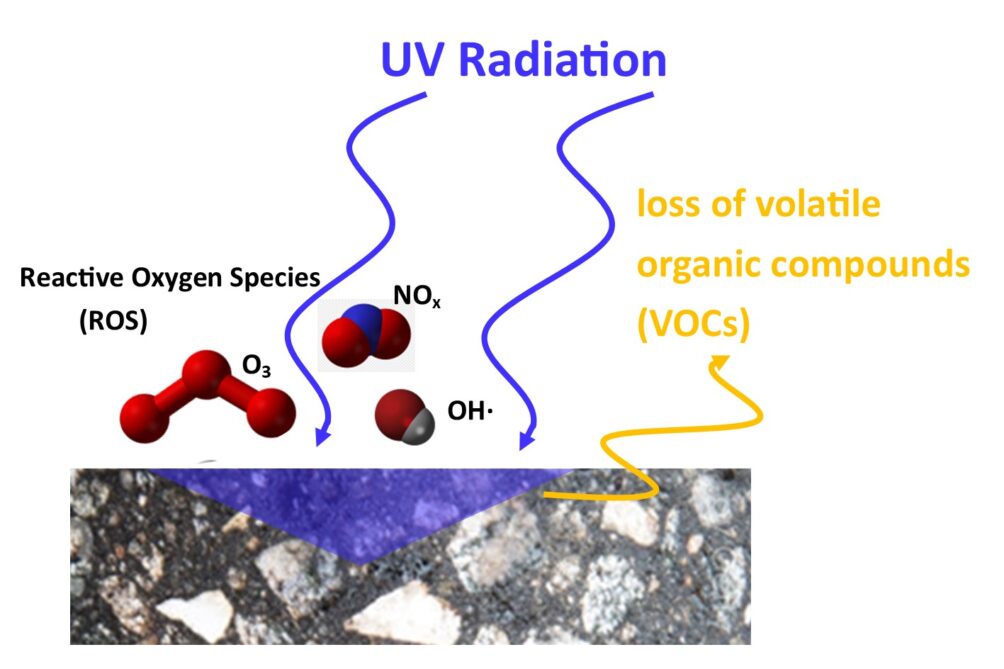 Photo: Aging mechanisms on a bitumen surface: UV aging, Reactive Oxygen Species – NOx, OH radical and ozone – and the loss of volatile molecules which also makes the material brittle.