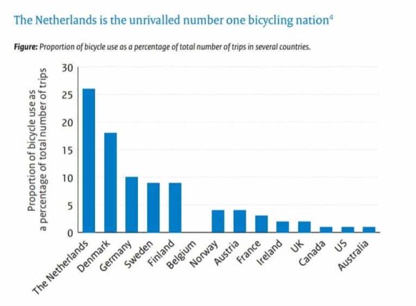 As the old cliché goes, The Netherlands has more bicycles than it has inhabitants. But what about bicycle usage in the rest of Europe? For example, the Dutch are said to have an average of 1.3 bicycles per inhabitant. The Netherlands is leading the list when it comes to the bicycle as the preferred mode of transport. (The Dutch use bicycles for 27 percent of their journeys.) Denmark follows with almost 20 percent. In third place is Germany, where they pick up one of those steel horses 10% of the time that they are out and about. Closely followed by Finland and Sweden, who are just under 10 per cent.