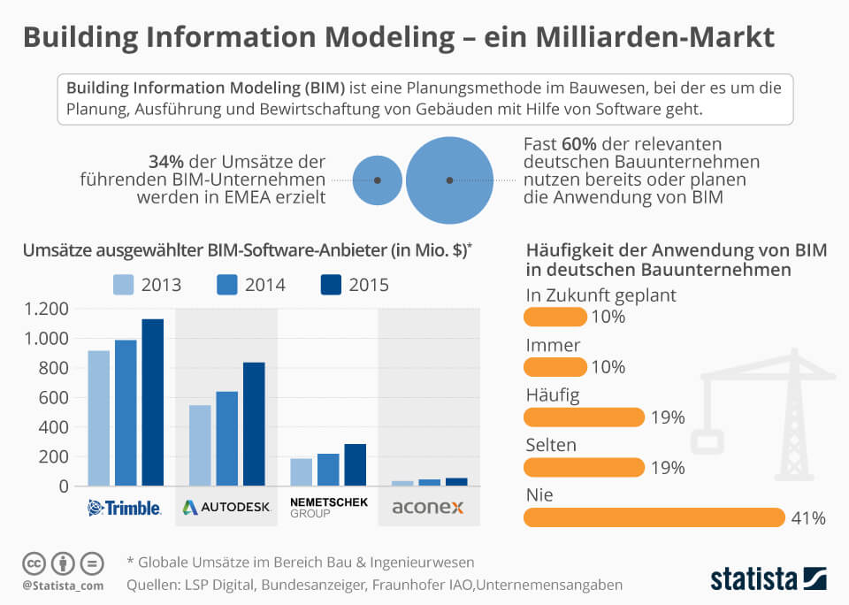 But the market is also tempting. BIM’s building data modeling is a planning method in the building industry. It is about the planning, execution, and management of buildings with the help of software. Numerous construction companies in Germany already rely on this, as Statista has found out. Building data modeling is, therefore, becoming increasingly popular, as can be seen from sales. Leading manufacturers such as Aconex, Autodex, Nmetschek and Trimble generated USD 2.3 billion in 2015. The EMEA region in Europe, the Middle East, and Africa accounted for 34 percent. The forecasts are positive. Analysts estimate the market volume at 11.5 billion US dollars for 2022. So in November during BIM-World, a lot of innovative potential in building data modeling comes together.