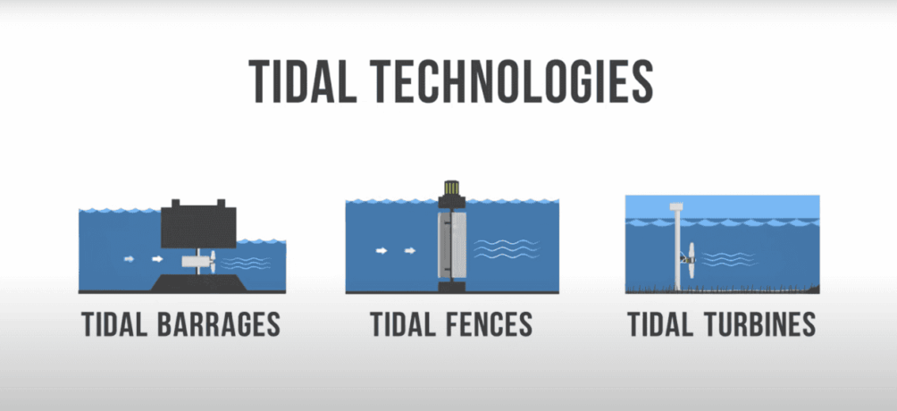 Tides result from the rotation of the Sun-Moon-Earth system and the subsequent variations in the gravitational force on Earth. Tidal energy is best harnessed with underwater turbines, which are smaller versions of wind turbines with stronger blades—bear in mind that water is about a thousand times denser than air. Another way of harnessing tides’ energy is through tidal barrages, which exploit the difference between water levels similar to hydroelectric dams. While hydroelectric plants pump water up and down in tidal barrages, gravity naturally creates the difference.