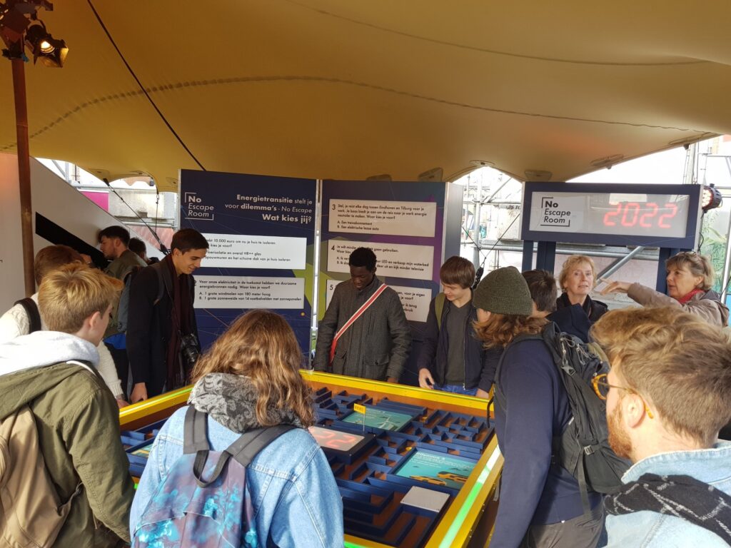 The game ‘No escape-room’ was set up with more or less the same goal in mind. In this game, people have to solve common dilemmas about reducing CO2 emissions. A group of young people play fanatically, but the game also evokes a substantive discussion about insulating a house and reducing electricity consumption. Next, to the fanatical students, people are cooking, which can be smelled all over the site. Urban Food Farm is a concept in which the crop is grown by a robot, pixel farming. This would mean that in the future no more food would have to be imported, but that a whole meal could be grown by itself. In the Urban Food Restaurant, a wide variety of dishes are made from these crops, tailored to the choice of the visitors.