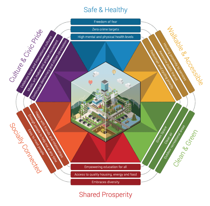Combining insights from the 3 generations of smart cities, from our interviews at the Smart City Expo and insights from working in the cities arena for the past several years and leveraging the work on measuring happiness around the world, particularly from the Kingdom of Bhutan’s gross national happiness, we developed the Happy Citizens Hexagon.