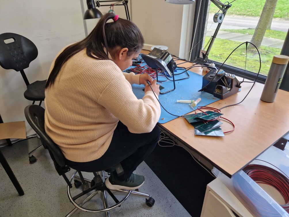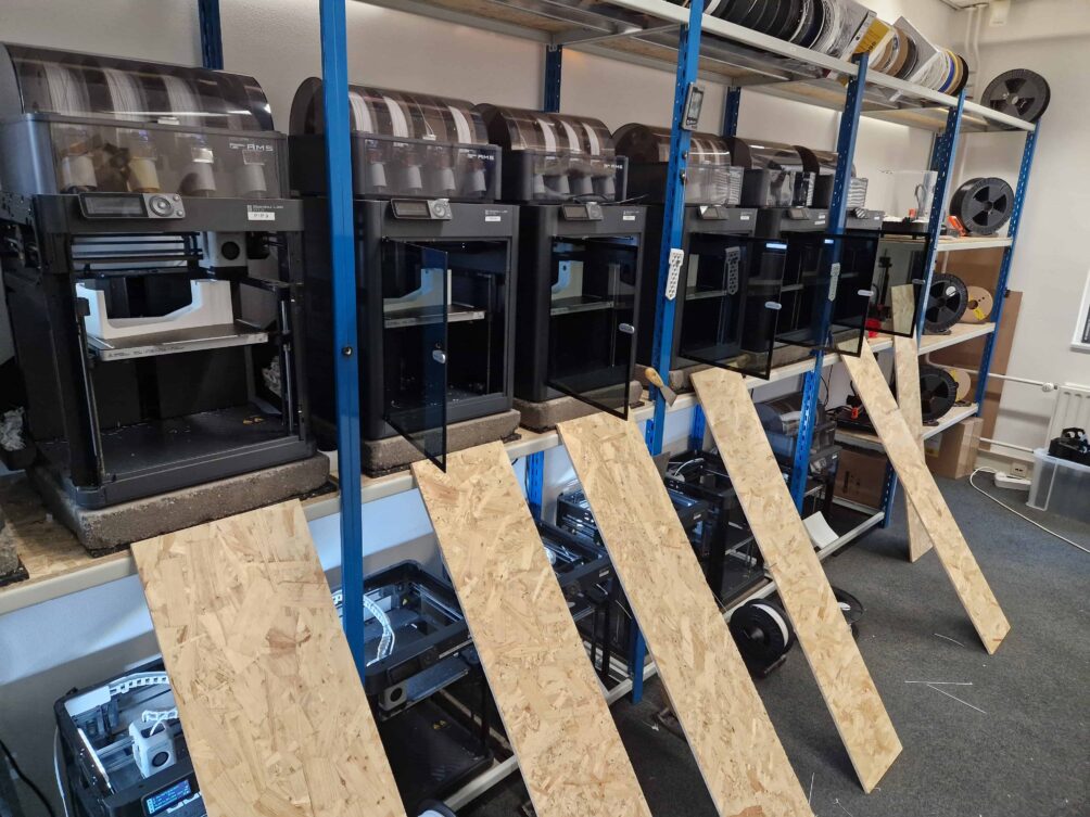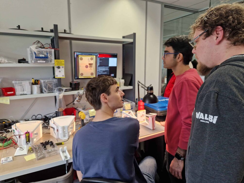 PATS has an in-house production line. In another room of the corridor, a stack of 3D printers briskly produces all the parts needed for the control system and the sticky trap. Next to it is the assembly line, where the staff puts together the freshly printed components while other staff members discuss ways to optimize processes. A robotic arm stands out in another testing room equipped with working tools. Here, two engineers experiment with a robotic arm to upgrade and possibly automate the production line. At the moment, around twenty people work at the company.