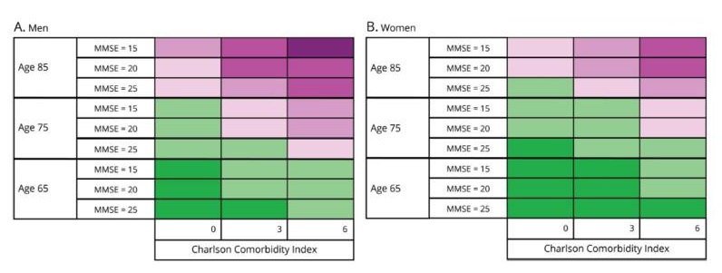 Now something has been done about that. Sara Garcia-Ptacek (from the Karolinska Institute in Stockholm) and her colleagues studied the data of 50,000 people over the age of 65 who had been diagnosed with dementia between 2007 and 2015. They were also included in the Swedish dementia register. During this period, an average of 20,000 people died 4.8 years after their initial diagnosis. The researchers investigated the influence of a number of easily recognizable factors on post-diagnosis life expectancy and devised two clear, schematic charts.