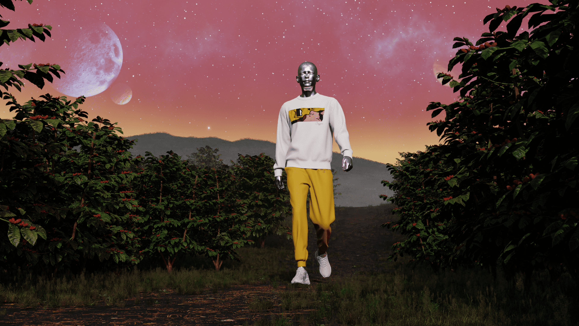 “I created a collection with a total of sixteen items and eight different looks. Imagine that you do a physical fashion show, and it turns out afterwards that two looks are liked and the rest not so much, then you will have produced items of clothing that you end up not using. So I came up with the idea of doing a fashion show in a virtual location with virtual models. A program then uses 3D drawings and turns them into 3D clothing items that the models wear. My virtual models wound up walking around a coffee plantation during the fashion show.”