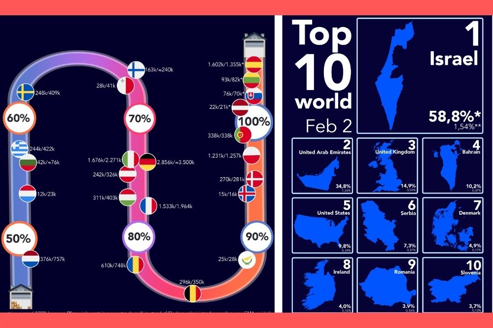 If the current pace is sustained, it will be many years before a lot of countries will have built up enough herd immunity to consign the corona pandemic to the history books. Which was the main focus of last week’s issue. This week, ‘Corona in Europe’ is about why the global group of frontrunners group are increasingly disappearing from view. This can be clearly seen by comparing the top ten this week with the top ten of two weeks ago.