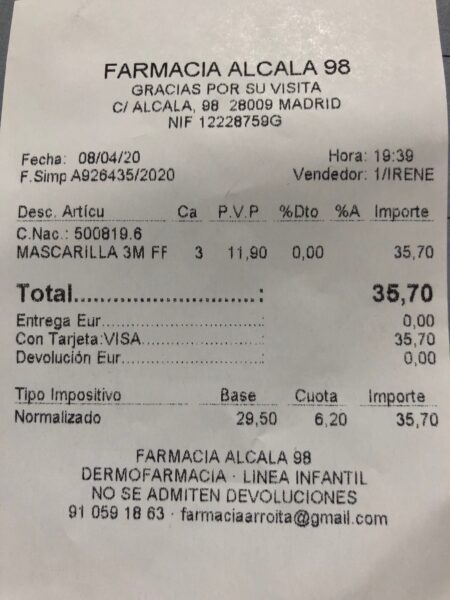As the confirmed infections and deaths continued to rise, the call for face masks in Madrid grew louder and louder. In April the long awaited shipments finally arrived from China. It soon became apparent that the quality of hundreds of thousands of face masks was so substandard that it was actually irresponsible for healthcare personnel to use them. But for lack of alternatives, they were nonetheless in high demand. Pharmacists were finally able to sell something to concerned citizens. And so in the second week of April, for the first time in my life, I bought a face mask. The “substandard” mask cost me €3.