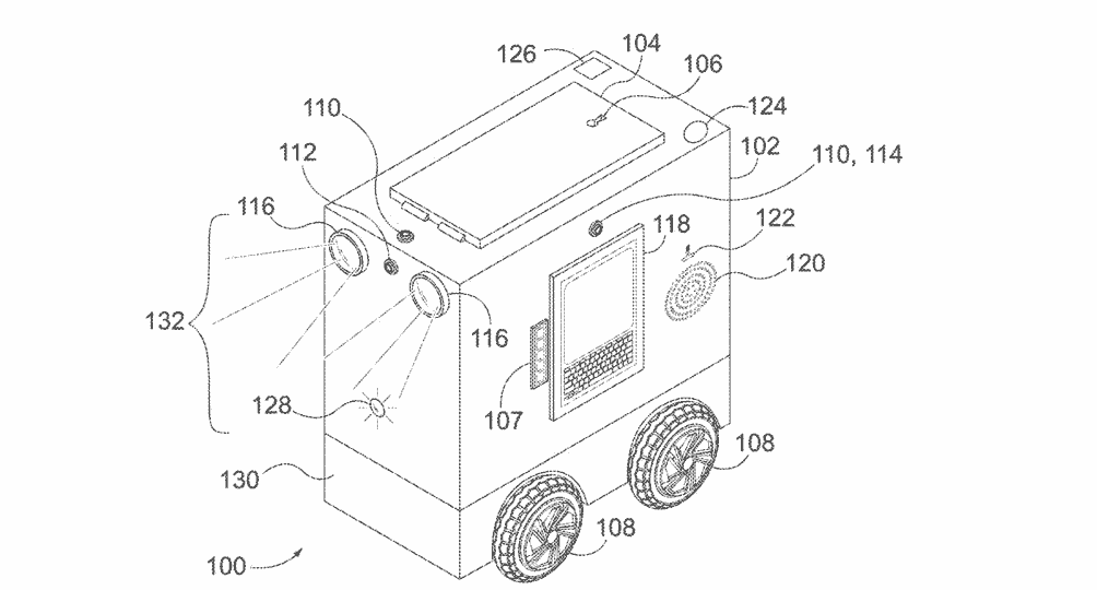 According to the patent’s abstract, the mobile locker can communicate with a monitoring center that oversees the deployment of multiple mobile lockers. The Robot Sherpa can also interact with customers through a display, microphone, and speaker, allowing for seamless communication between the guest and the locker system.