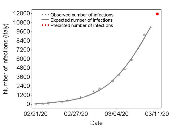 The researchers predict that the number of infections and deaths in China will remain stable over the next few days. The rise in the number of infections in Iran and South Korea will start to level off over coming days too. The eventual maximum number of infections for South Korea and Iran are estimated by the researchers right now to be respectively above 8,800 and 10,000 infections. In Italy, the sharp rise is expected to continue. With a predicted total number of infections of almost 12,000 after today. That’s 18% more than yesterday. Along with as many as 850 deaths. A 34% increase since yesterday.