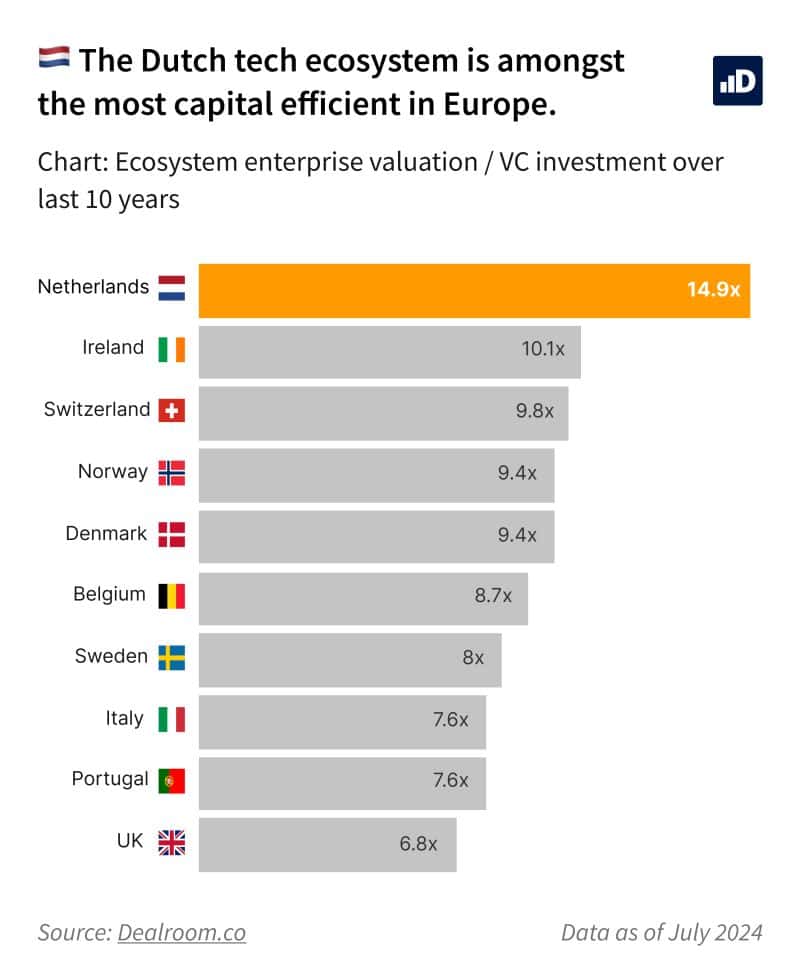 The Dutch tech ecosystem is among one of the most capital-efficient in Europe, according to a new analysis by startup intelligence bureau Dealroom.co. The ratio between ecosystem enterprise valuation and venture capital (VC) investments over the past decade is 14.9 times in favor of the former.