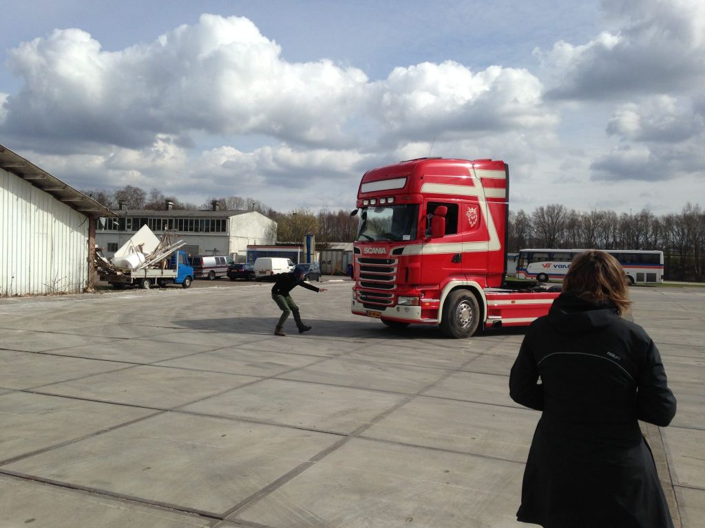 With graceful movements Huub Smit puts on his glove. He steps back and moves his hand slowly, as if he pulls an invisible rope. With a roaring engine, a truck moves in his direction. The man raises his hand, stops. Shocking and squeaking, the truck stops as well. What follows is a cat and mouse game: first the truck is pushed back by the man, then the man tries to escape from the truck. Who is in control? The truck or the man? That is the question.