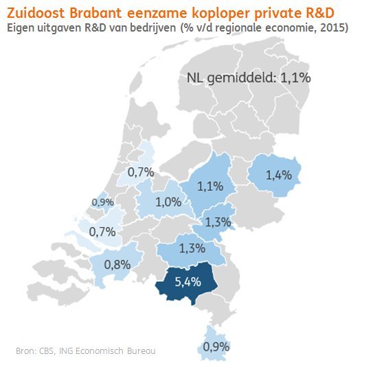 With a short message on Tuesday, ING confirmed a situation that actually dates back to Philips’ high days. “South-East Brabant is heading with a huge distance compared to the big cities of Amsterdam, Rotterdam, Utrecht and The Hague.” Of course, Eindhoven’s global top position as the place-to-be for new patents is closely related to this R&D-effort. For ING, it is proof of the strength of the region: “Not underestimating the importance and contribution of education and public R&D, it is an important sign for the local economy that companies are willing to invest so much more than elsewhere.”