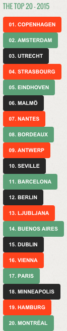 Anyway, fifth in the world, that’s not something to be sniffed at. And what a strange coincidence: on the same day that the city announces the removal of 480 out-of-order electronic bike docking stations, it seems our bike policy is better than that of, say, Paris, Barcelona, Berlin and Montreal. And the fact that Copenhagen (1), Amsterdam (2), Utrecht (3) and Strasbourg (4) are still ahead of us this year, well, that’s just an incentive for the coming years.