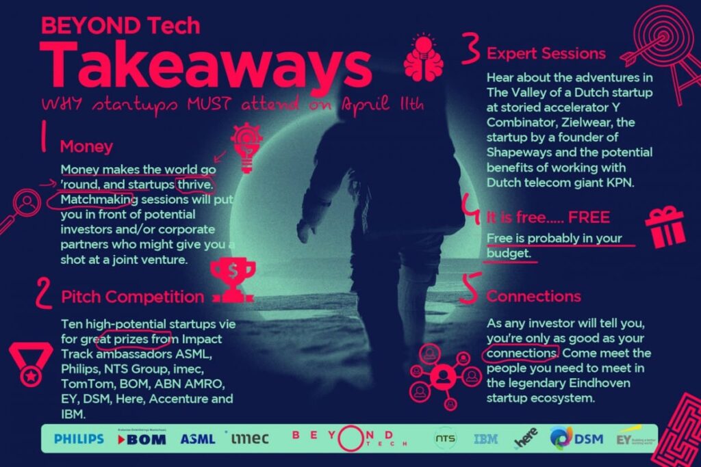 Beyond Tech builds on last year’s Beyond XL, also held in Eindhoven. “This year, Beyond Tech is going, well, beyond what we did last year. It is an international event as we have invited startups, investors and speakers from all over the globe”, says Betsy Lindsey, Managing Director of HighTechXL. “Brainport is fast becoming the high-tech capital of the world, and we think there’s no better way to put the spotlight on Eindhoven than to hold a high-tech conference on High Tech Campus. We also help the fundraising flow for startups by matching them with potential investors and corporate partners for future collaboration.”
