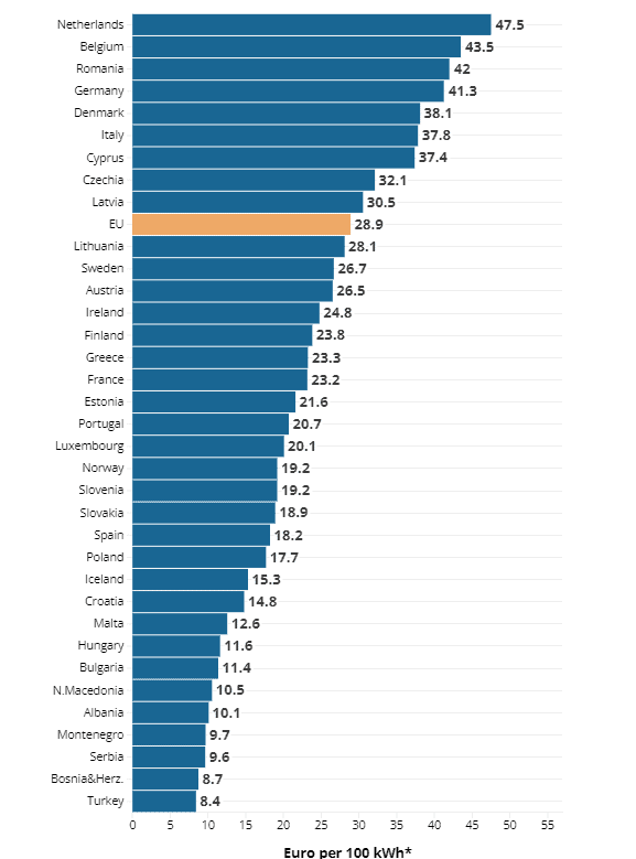 - Belgium, Romania, and Germany had the highest pre-tax electricity prices in the EU, while the Netherlands had the highest electricity and gas prices.