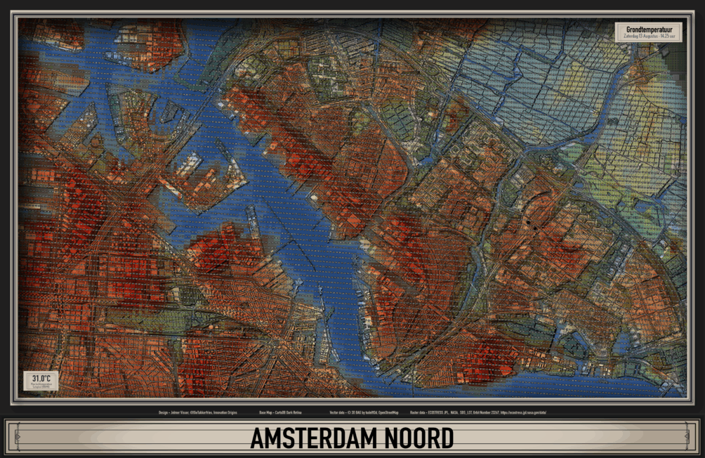 A final notable heat island can be spotted at Buikslotermeerplein, where it warms up more or less as much in the shopping area as in the heart of the city center on the other side of the water, where we also find the second map of this episode.