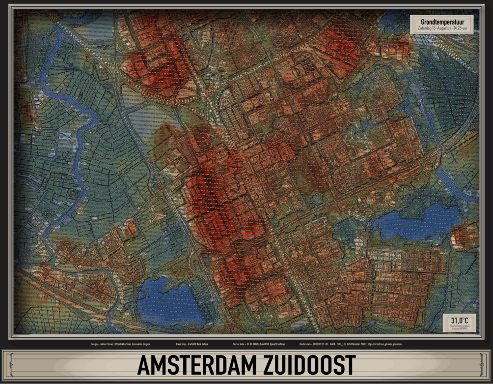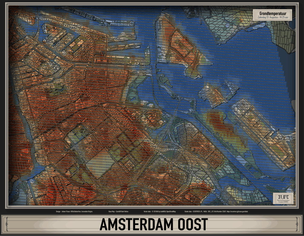 The tenth episode of the Innovation Origins heat island series focuses – for the second time – on the capital’s city heat stress. The first part already covered the city districts of Centrum, South, and West. This time we zoom in on the situation in North, East, and Southeast. This way, a complete picture of all Amsterdam neighborhoods is created; it will become apparent after this second part what the warmest residential areas of the Dutch capital are on a hot August day.
