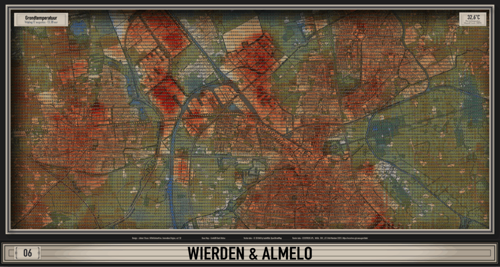 The super-sized final map of this eleventh episode contains nine of the sixteen region maps with the interactive zoom tool at full resolution. The fact that the sparrows are not literally falling off the roof all over Twente is obvious here. Aside from the hot inner cities of both Hengelo and Enschede and some industrial estates where the mercury rises to as high as 54℃ the issues in most of the surrounding villages remain quite manageable. Especially in Borne and Delden, the situation appears to be perfectly under control.