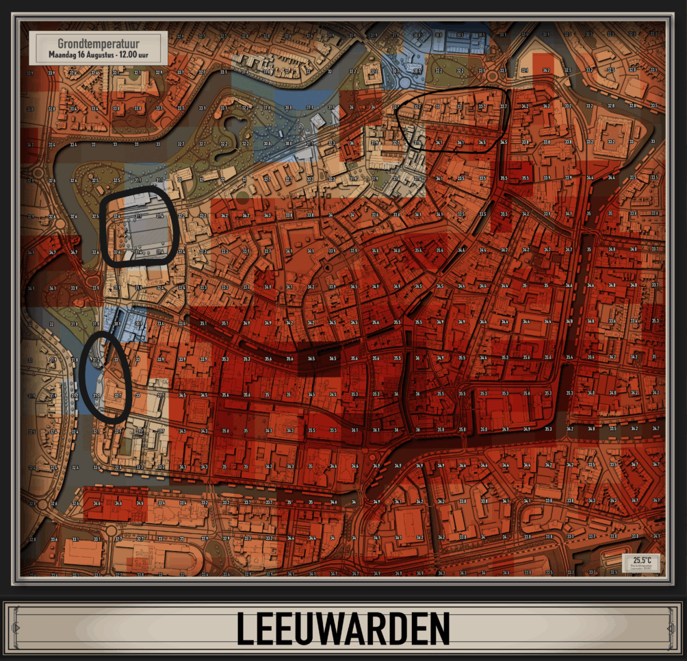While the center is admittedly free of such outliers, at the same time a sizeable area with values above 45℃ has been measured here. This could rise to around 46.5℃: this did not exactly make Leeuwarden the best kid in the class in this series, but also not that serious of a case. Waagplein and the old narrow streets north of Nieuwestad warmed up the most.
