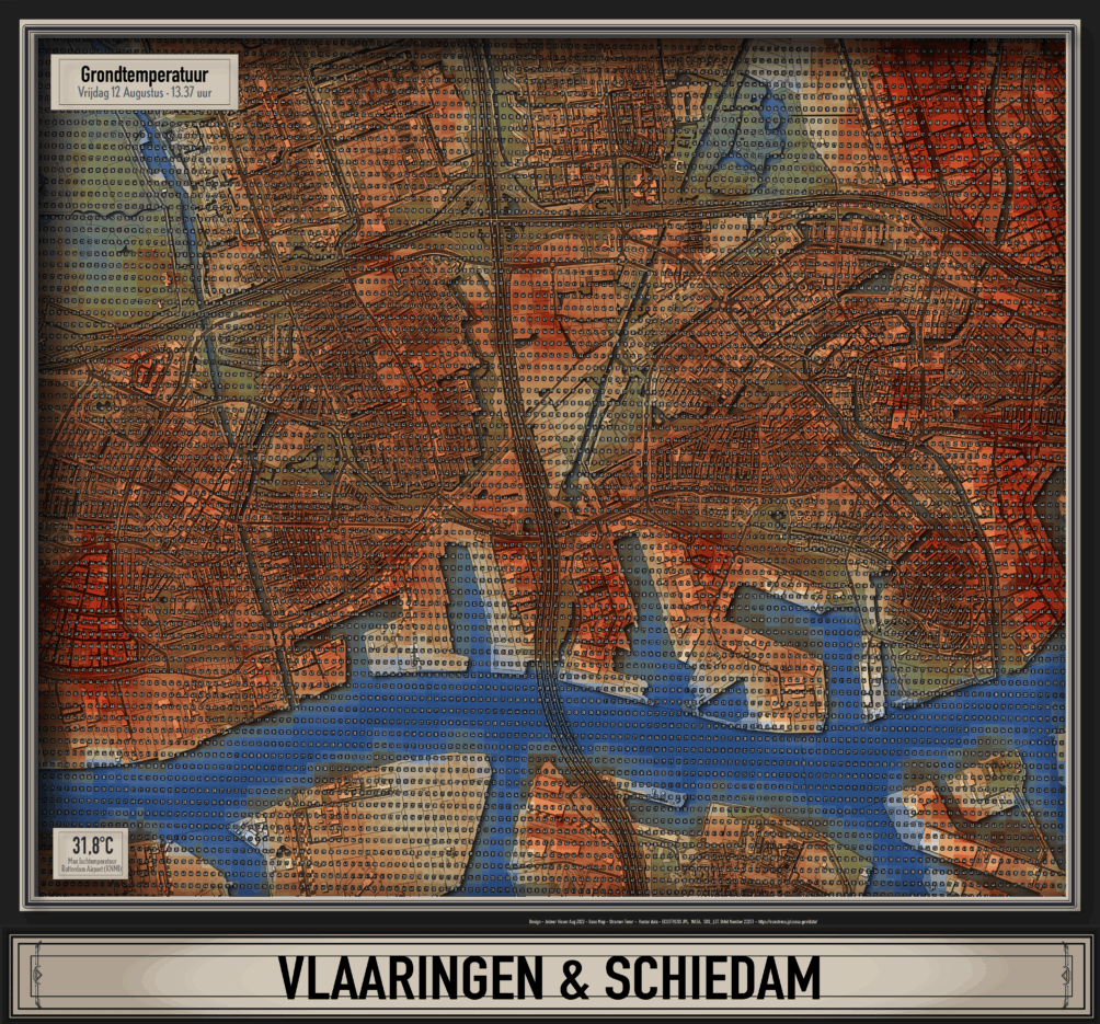 A few kilometers away in the Vlaardingen shopping district, the temperature of 45°C was barely reached under the roof of the shopping arcade and in the Stationsstraat. Oostwijk is a comparatively warm neighborhood, while Holy Zuid offers ample cooling. The Vopwijk industrial estate is the hottest spot in the city, with ground temperatures reaching 49 °C. It seems that the Klauter Forest in the far west is the ultimate oasis for cooling in this region.