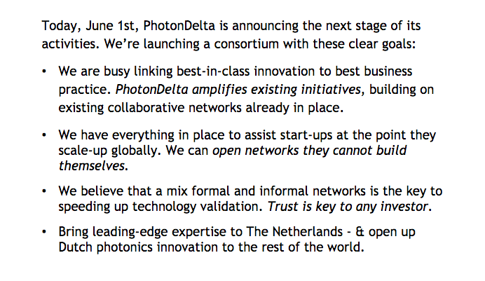 Photondelta is a cooperative designed to operate on behalf of members, reaching goals which they cannot achieve on their own. “We’re there to protect their knowledge, and protect the IP. And we can create attention from global investors such as venture capital.”