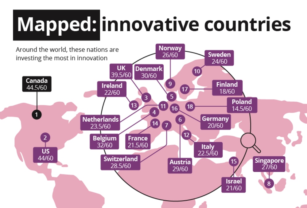 The “innovation investment index” is compiled by Money, an independent financial comparison service from the United Kingdom. The index is a summation of key indicators of innovation in eighteen countries from mainly North America and Europe. However, it is still too early to hang gold, silver and bronze on the winning European trio (UK, Belgium and Denmark) just yet. In the overall ranking, Canada and the United States are doing even better.
