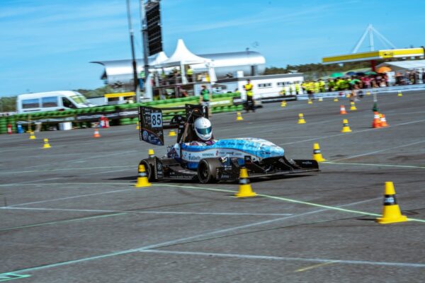 The dynamic categories start with the evaluation of the acceleration of the vehicle from a standing start across a 75 meter track. In addition to traction, it is the right engine design that matters in terms of greater power or the highest possible torque. During the Skid Pad event, the cars have to drive two 8-figured laps on a course marked with pylons without knocking them over. The lap time for the second lap gives a comparative value for the maximum possible lateral acceleration of the vehicle.