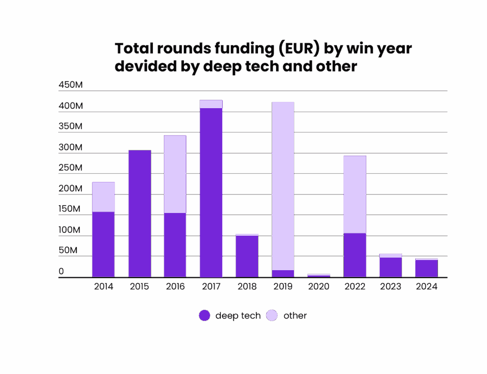 One of the dashboard’s features is the breakdown of funding by the year startups won their awards. Deep tech startups stand out significantly and make up the bulk of funding. For example, the deep tech winners in the last three years all received more funding than their peers of that year.
