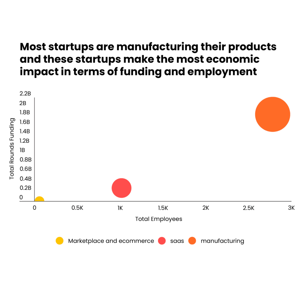 Manufacturing startups lead in terms of economic impact. These companies make up the majority of the total economic contribution, commanding close to €2 billion in funding and employing over 2,500 people.