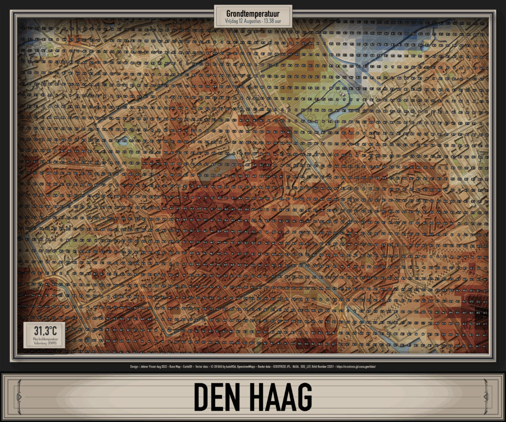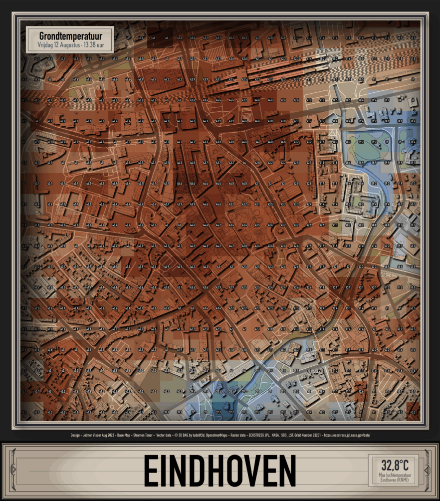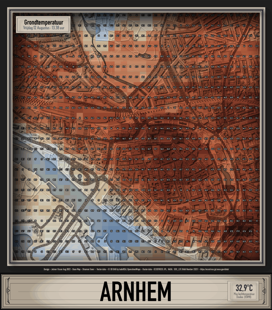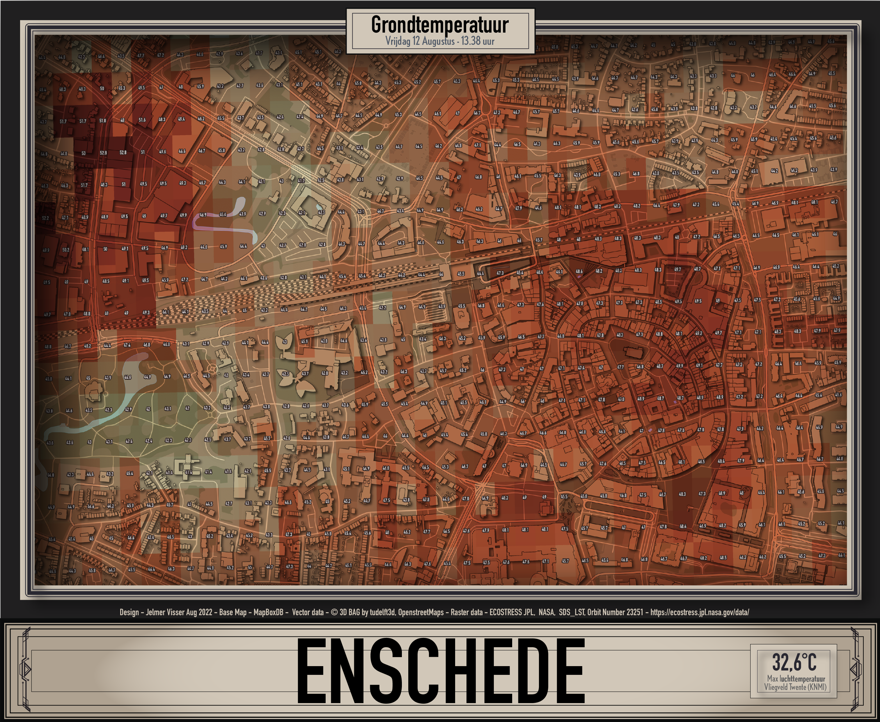 On Friday, August 12, the satellite flew over at precisely the right time. At that time, it was cloudless almost everywhere in the Netherlands and also above thirty degrees Celsius. We already covered Enschede in the first episode. Now that the processing and design process has been reorganized more efficiently, three more cities will be added twice a week.