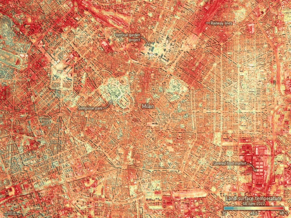 All the greenery certainly contributes to filtering air and absorbing lots of CO2 in a busy and densely built city like Milan, but also provides defense against the summer heat. The effect is also shown in last year’s snapshot of Milan by the European Space Agency Sentinel satellite. All around the Bosco Verticale complex, a bubble with a lower land surface temperature could be observed.