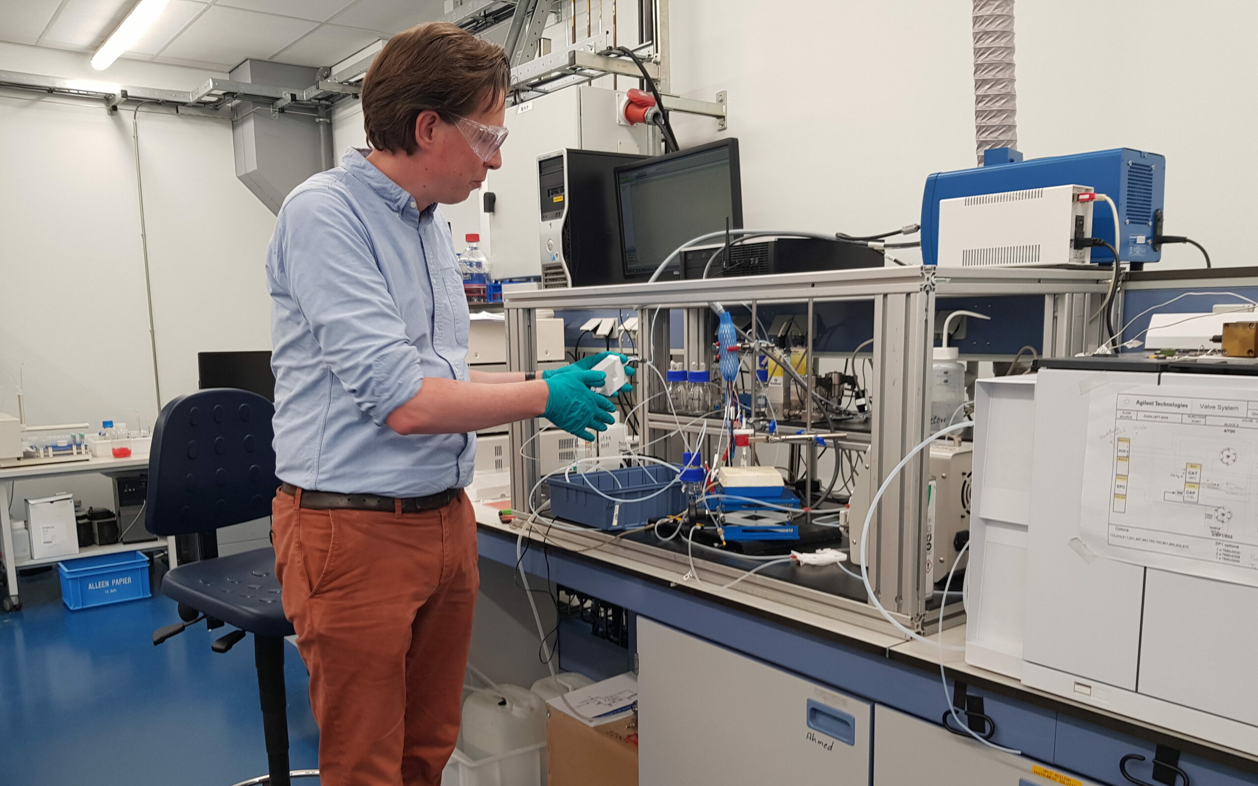 A Daedalean labyrinth of pipes and equipment is what the e-Refinery institute looks like. But there is also room for smaller labs. In one of them, Ruud Kortlever – together with his colleagues – is working on accelerating the production of sustainable fuels that are generated using water or electricity.