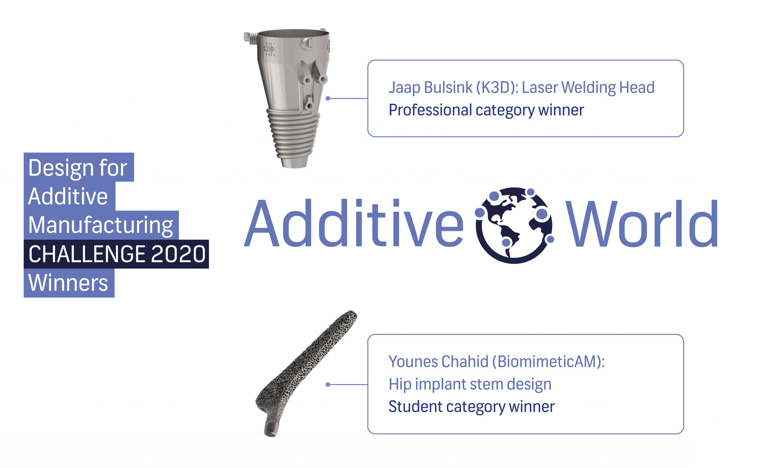 K3D has won the Additive World Design for Additive Manufacturing Challenge for the second consecutive time. During the 8th edition of the Additive World Conference that took place online because of Corona, the chairman of the jury, Ultimaker’s Steven van de Staak, announced the winners. Besides K3D, this was also Younes Chahid, who won the prize in the student category. All six finalists were able to explain their designs in a short video presentation in front of the six members of the jury. The winning designs, a ‘Laser Welding Head’ and a ‘Hip Implants Stem Design’, are, according to the jury, both inspiring examples for industrial applications of 3D metal printing.